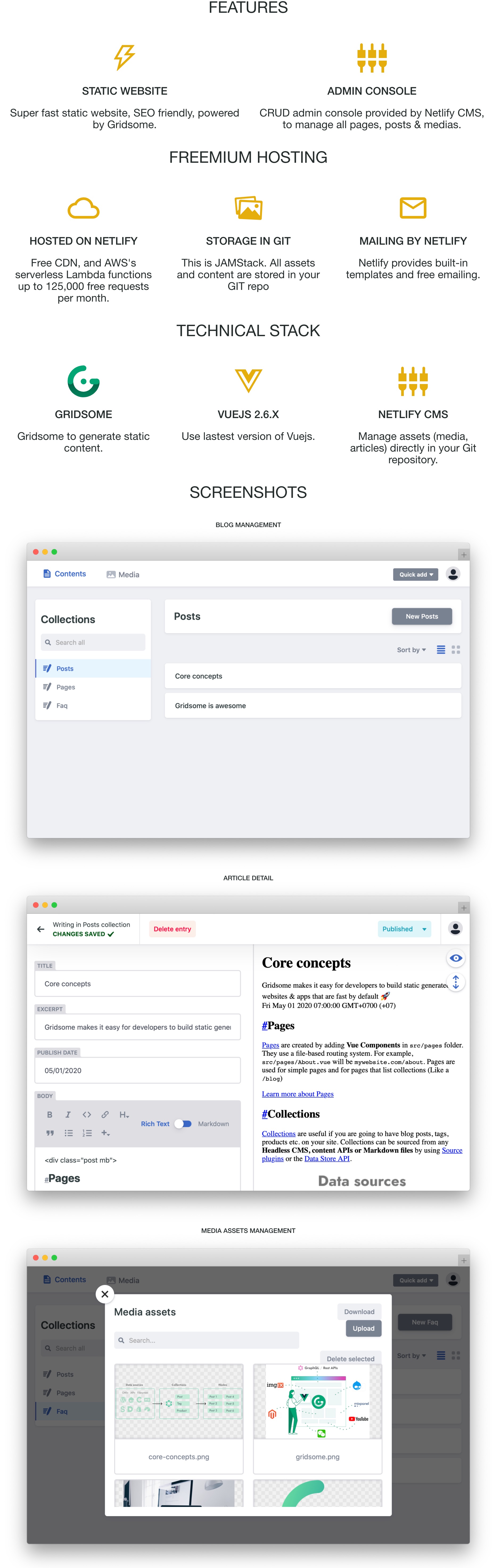 Gridsome Netlify CMSFreeA Gridsome, Netlify CMS & Tailwind CSS starter project. Gridsome is an awesome Jamstack framework for Vue.js. FreeHigh quality code6 months supportFuture updates during 2 yearsSelect your technical stacktailwindBuyDemodocumentationPreviewRelated topicsgridsomenetlify cmsnetlifyvuejstailwindcss